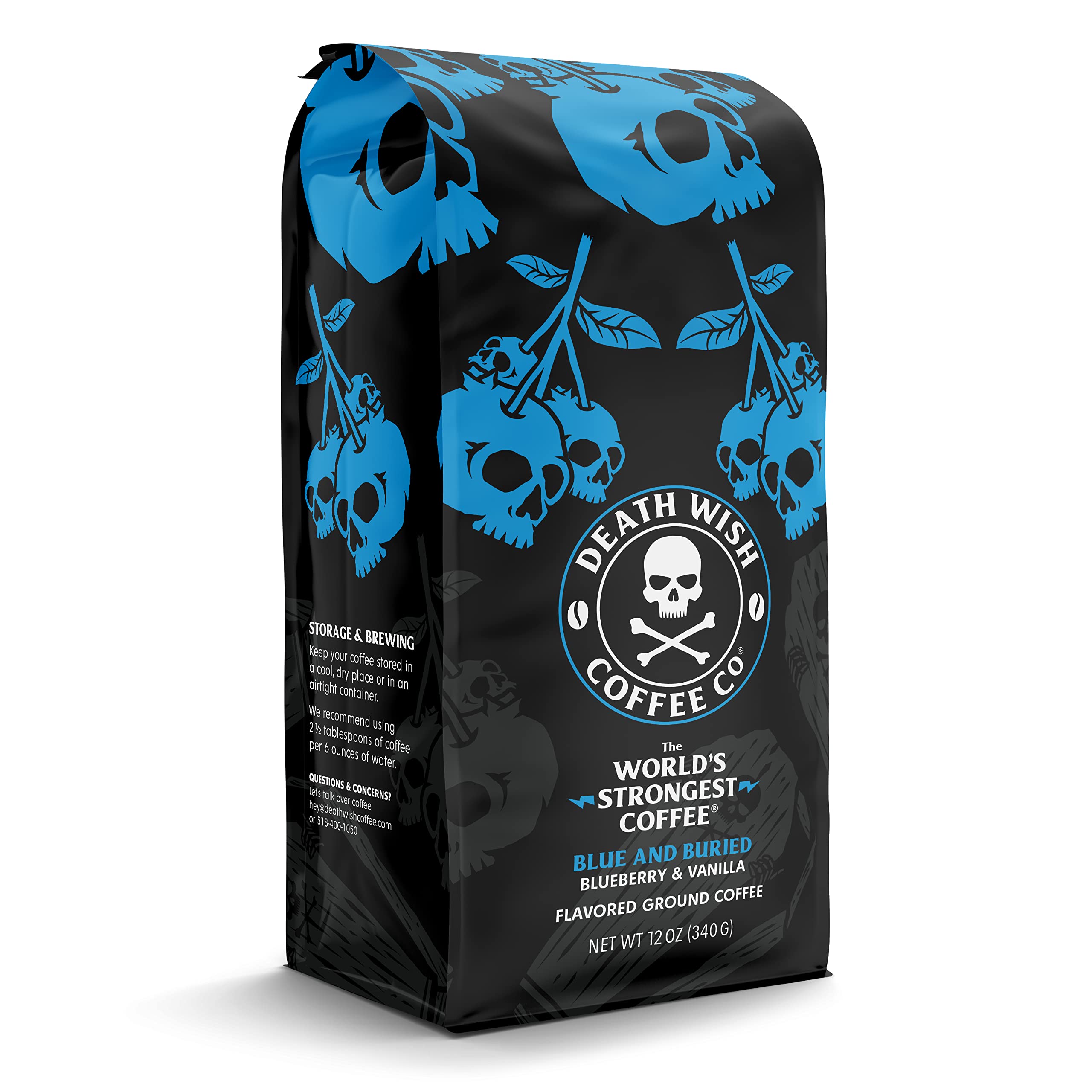 Amazon Com Death Wish Coffee Ground Coffee Extra Kick Of Caffeine Blue And Buried Blueberry Vanilla Flavored Coffee Grocery Gourmet Food